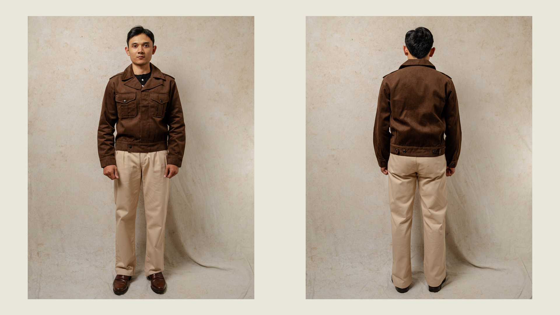 Harold Battle Dress Jacket is our interpretation of the 1950s U.S. Army Ike jacket: a service uniform worn during the Korean War. A classic yet refined style. Beautifully made from 100% cotton Moleskin fabric & lined with poly-cotton fabric. With its 2 big front flap pockets and inner pockets, it’ll ensure your essentials are safe & are easily accessible. Cut in a slim fit, a well-tapered through the waist & is cut short on the length.