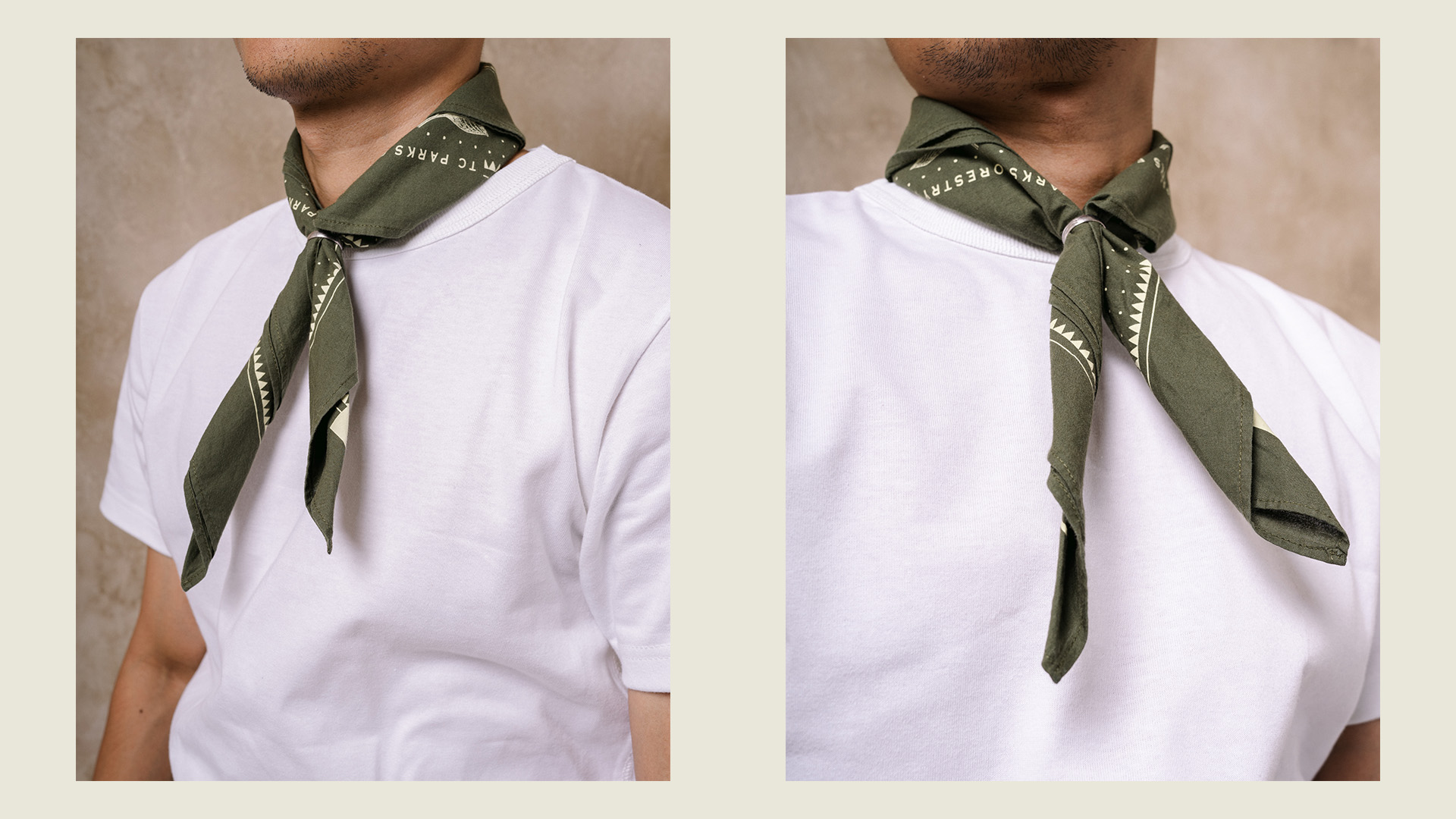 The T.C. Parks Forestry Bandana is constructed with lightweight, 100% cotton cloth, washed for extra softness and a worn-in look. Screen-printed with an American National Parks & Forest Ranger-inspired design. Made entirely by hand for a unique finish. No two bandanas are alike.